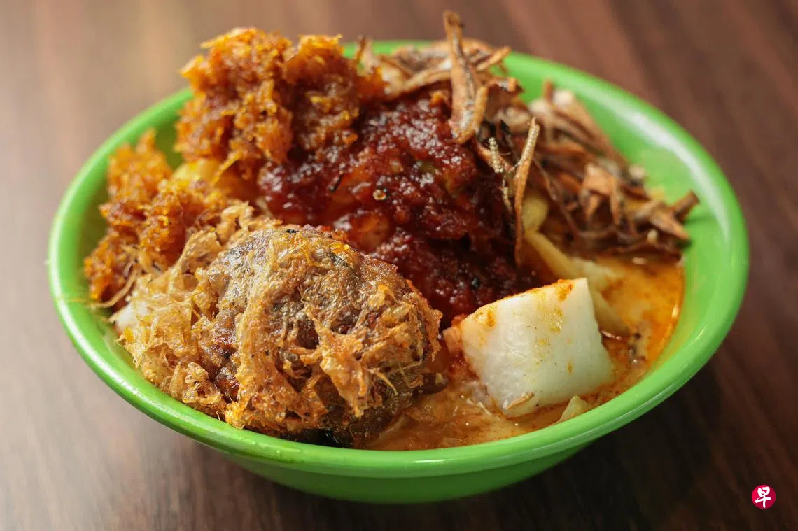 这家老字号人龙不断,售卖马来卤面、隆冬(lontong)、马来面汤(mee soto)等。隆冬售价从$4起,胃口好的话,建议直接选$5的。加上满满的配料,如米糕、豆干、炸马铃薯饼(begedil)、包菜、炸江鱼仔、炸椰丝和参峇辣椒酱,令人望之即垂涎。