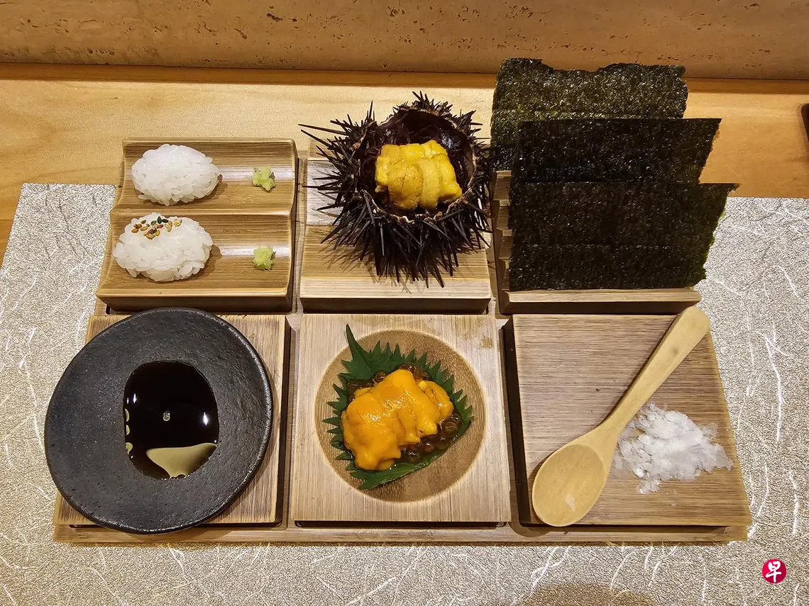 海胆双拼,让人一次过品尝紫海胆(murasaki uni)和马粪海胆(bafun uni)。紫海胆有长长的刺,颜色较淡,口感湿软。亮橙色的马粪海胆色泽诱人,口感绵密。上菜方式颇特别,海胆、寿司米饭和紫菜分开摆放,食客自行组合起来。