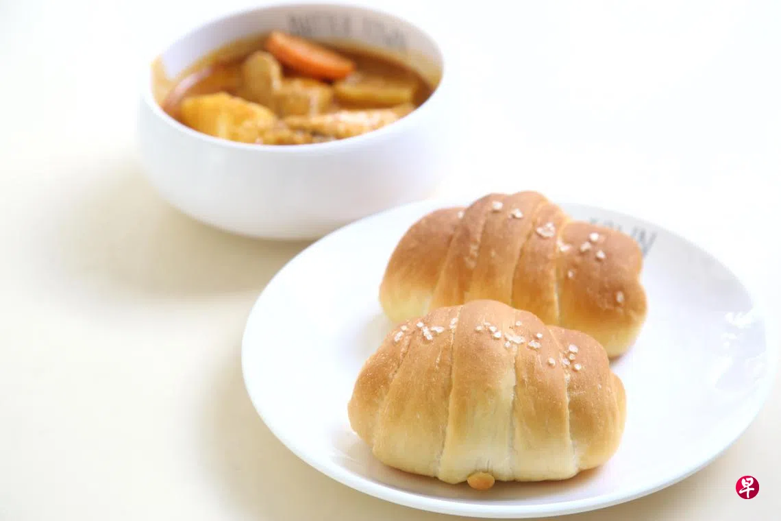 再度到访熟食中心时,发现这摊人龙不断,决定再次探索。魅力原来来自日式盐烧面包(shio-pan),它的形状有点像牛角,还有可爱的译名“小胖”(日语盐shio 面包pan,盐发音近似福建话)。这款面包外层金黄,口感外酥内软不油腻,散发奶油香气。有原味、明太子洋葱、Kopi C、红豆、枫叶糖浆培根和巧克力等口味,一个$2起。