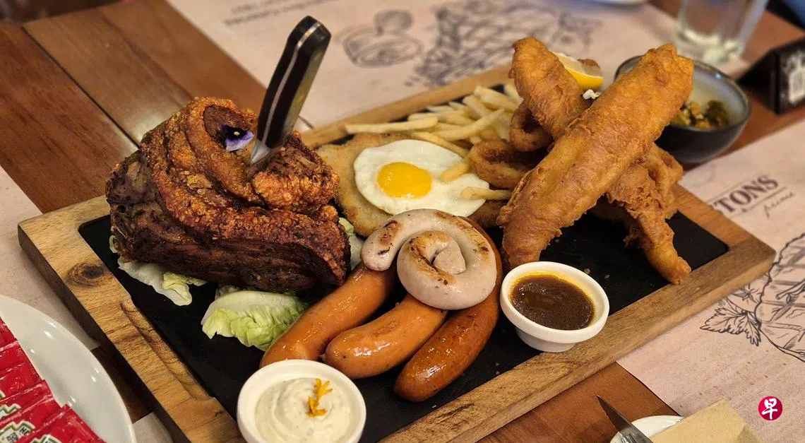 记者试吃了可供四至六人享用的套餐,包括1.3公斤德国猪蹄、一份炸猪排(Holstein Schnitzel)、一份炸鱼薯条、三条德国芝士香肠、马铃薯沙拉和蔬菜沙拉、自选三款配菜、四杯Erdinger啤酒。单单一份德国猪蹄就要价$38,啤酒一杯$10,所以这个套餐很划算。