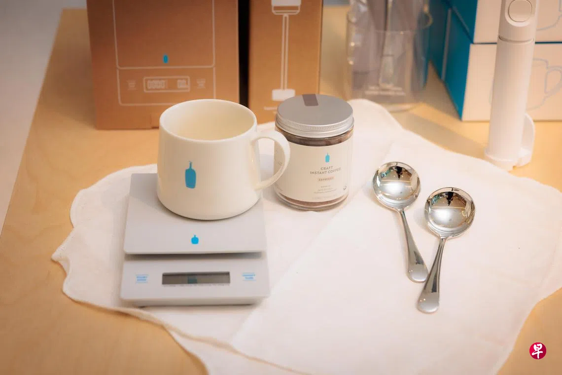 美国精品咖啡连锁品牌蓝瓶咖啡(Blue Bottle Coffee)在狮城开设首家东南亚分店,设在来福士城购物中心的日本百货Lumine内。这家以售卖礼品为主的店中店,不设蓝瓶咖啡座,只售卖蓝瓶咖啡系列商品,包括即溶浓缩咖啡、饮具和泡制咖啡的配件。该即溶浓缩咖啡的味道香醇,有黑巧克力、糖蜜和烤麦芽风味,方便在家自己冲泡。