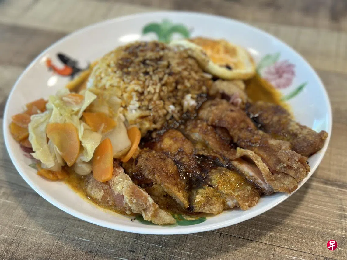 咖喱饭配有自家特制鸡肉卤汁,辛辣适中,契合本地食客口味。个人推荐餐馆招牌——No.1霸王炸鸡排咖喱饭($6.90),配有一块外酥里嫩的XL特大块自家腌制炸鸡排,搭配焖包菜、红萝卜和煎蛋,分量十足。此外,菜单上还有咖喱鸡饭($7.90)、仁当牛肉饭($7.90)、巴当鱼咖喱饭($7.90)和炸鱼咖喱饭($5.90)等供选择。多付$1,可享用一杯酸柑水配餐。店家的咖喱风味带有适度辛辣感,与甜咸交错的卤汁相得益彰。