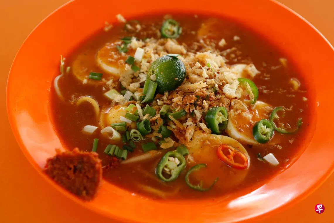 在许多小贩中心,马来卤面摊主多为马来同胞。时鲜则不同,摊主虽是华人,却能煮出道地马来传统风味,专卖马来卤面和米暹,风味独特。马来卤面是传统马来面食,汤底浓郁,散发香料和虾米香气,爽滑的面条吸收汤底精华,搭配豆腐卜、水煮鸡蛋、鲜辣青椒、炸葱酥等配料,入口鲜美,挤上一点酸柑汁提鲜,再加上微辣的自制辣椒酱,口感丰富。米暹则是酸甜微辣风味,酸味来自酸柑汁,辣味则来自摊主特调的辣椒酱,十分开胃,深受喜欢酸辣口味的食客青睐。马来卤面和米暹价格亲民,小份$3.50,大份$4。