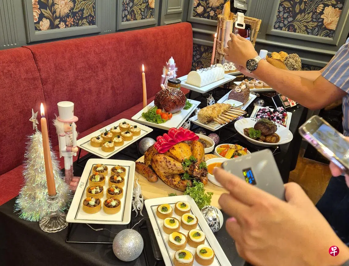 另一家法式餐馆Paul Singapore每年都会有一款亚洲风味火鸡,今年是班兰叶姜香烤火鸡,可配搭香料饭和参峇鹌鹑蛋等,即使不太吃西餐的长辈也容易接受。中西合璧的还有五香叉烧酱火鸡火腿,以及南洋咖啡焦糖布丁(crème brûlée)树桐蛋糕。