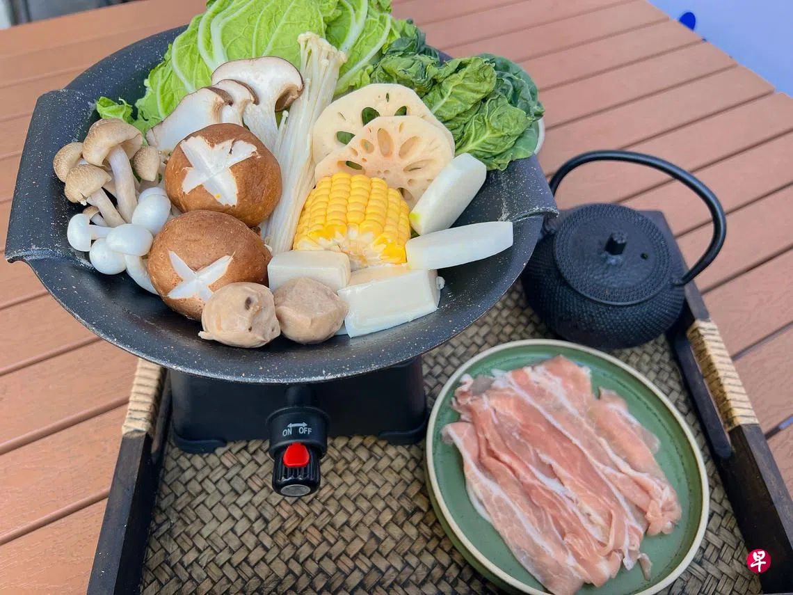 食物配料可选蔬菜、猪肉、海鲜、牛肉等,一人份套餐售价从$10.90++起。吃时,搭配泰式青辣椒蘸酱,酸辣中带清爽,非常开胃。