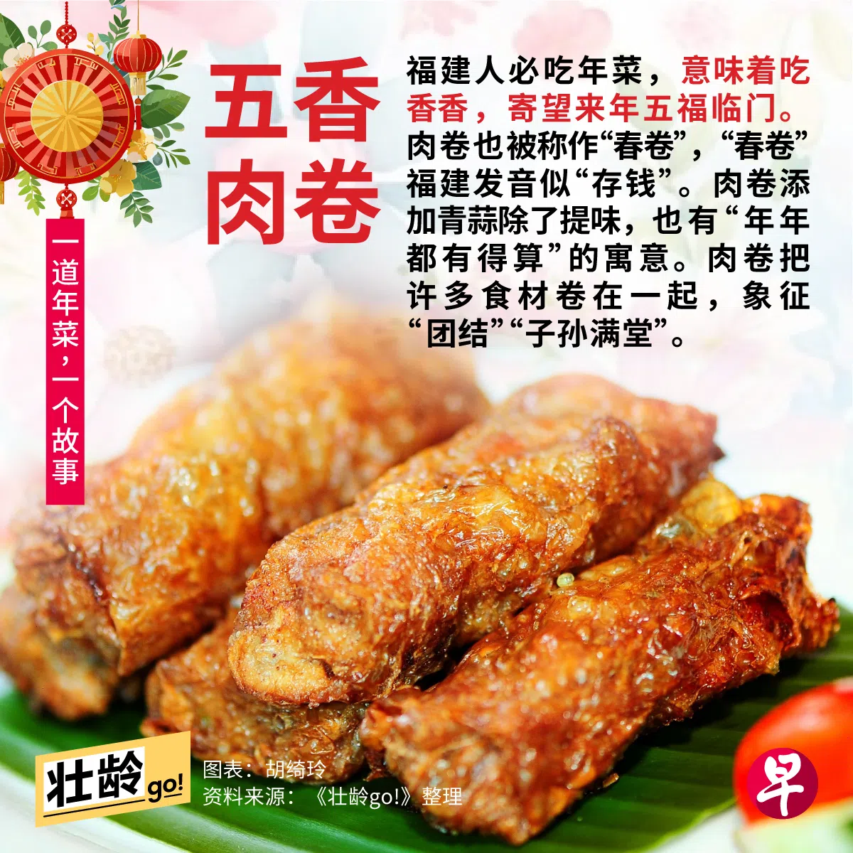 五香肉卷是福建人喜庆节日必备家常菜,意味着吃香香(福建话 jiak pang pang),寄望来年五福临门。五香是在制作过程中的五种主要香料,即:茴香、花椒、大料、桂皮、丁香。