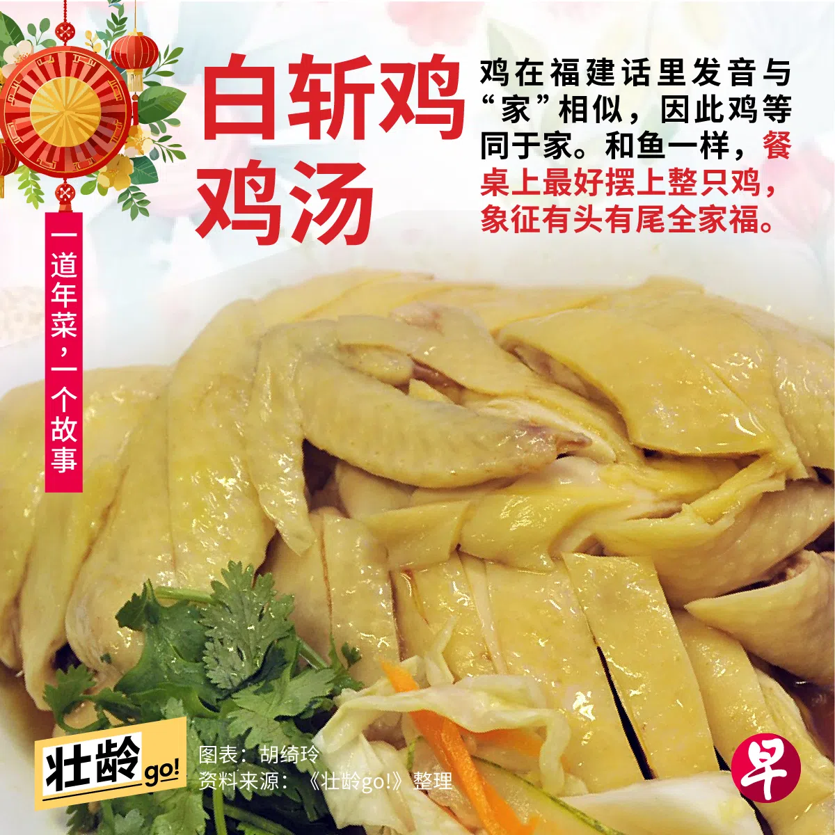 鸡在福建方言里,有 kue 和 ke 两种发音,后者和家的发音同音。有一句话说“吃鸡起家”,就是祈求整年家运兴盛昌隆,还有一说是鸡谐音吉,象征一整年都能大吉大利。