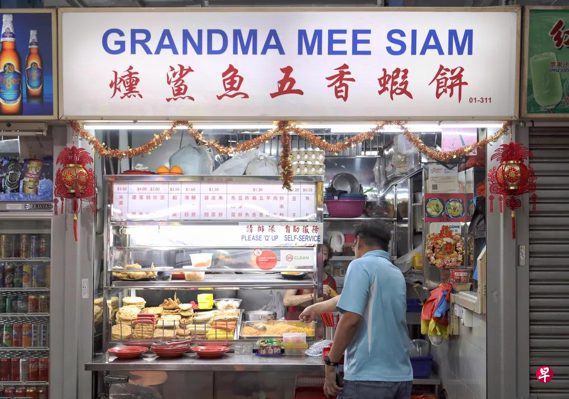 这摊老字号,虽然打着五香虾饼旗号,其实还有一个“主角”,即米暹(mee siam)。摊主继承阿嫲的米暹食谱,延续家传煮法,难怪摊位英文名是“Grandma Mee Siam”。摊主的父亲卖五香,因此有少见的米暹搭五香组合。古早味米暹味道轻盈爽口,酸度适中,辣度温和,有炸豆卜、青葱和一整粒鸡蛋,简单不失美味。五香选择繁多,从五香、灌肠、蛋卷、虾枣、薄饼、酥虾饼、皮蛋到马蹄糕等,搭炒米粉即为经典组合,或配米暹,又是一番新风味。