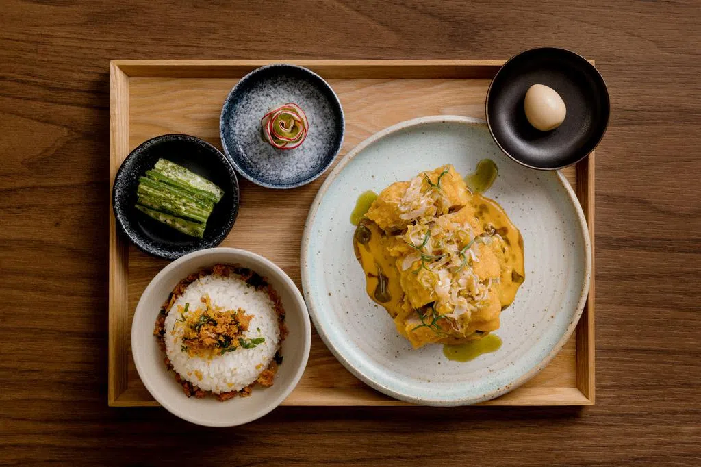 胜瓜东星斑汤($28)的鱼片鲜嫩滑口,搭配清甜胜瓜,汤底沁人心脾。松露野菌脆皮童子鸡(半只$16)是一道功夫菜,炒香的松露野菌巧妙酿入鸡腹,外皮炸至金黄酥脆。
