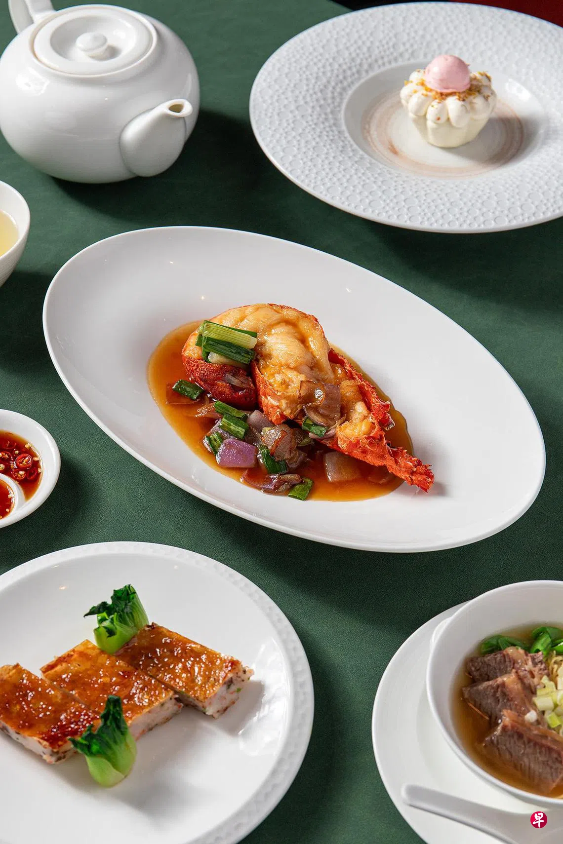 金沙石蚝伴葱油日本带子,将带子的鲜甜与咸蛋黄包裹生蚝的咸酥融合,交织出丰富味觉层次。浓鸡汤白玉官燕窝带有丝滑胶质感,燕窝清润细腻,与鸡汤交融,余味清雅悠长。柱候酱年糕焖多宝鱼咸香馥郁,鱼肉细嫩入味,年糕软糯中透着浓郁酱香。云腿竹笙酿白芦笋,以金华火腿的咸香激发白芦笋的鲜嫩。羊肚菌江南百花鸡则以手工剥离的鸡皮包裹弹嫩虾胶,佐以菌香浓郁的羊肚菌,重现传统粤菜的细腻与讲究。甜豆清汤牛腩面,清甜汤底搭配软嫩多汁的牛腩,面条爽滑弹牙。甜品则是白桃冰沙搭配白巧克力桂花蛋糕,清新芬芳。