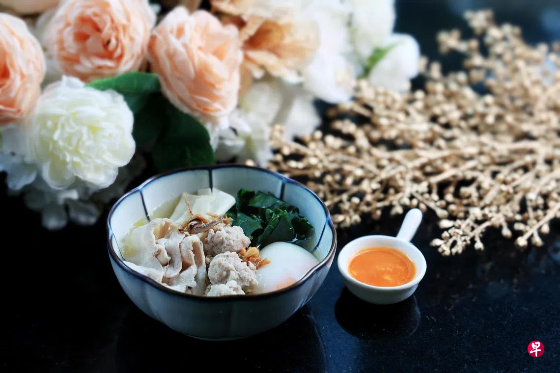 喜来登酒店的The Dining Room,这次为母亲节主打家常菜主题的自助餐,由烹饪团队的厨师复制各自母亲的传统食谱,每名厨师呈现两道珍藏的家庭菜,分享美好的童年回忆。行政总厨詹资才带来母亲的面粉粿和烤甜酱油鱿鱼。面粉粿的食材有猪肉碎、猪肉片、鸡蛋,还有詹资才在酒店花园种植的马尼菜。烤鱿鱼的配料,包括姜花、香茅和印度尼西亚甜酱油(kecap manis)。