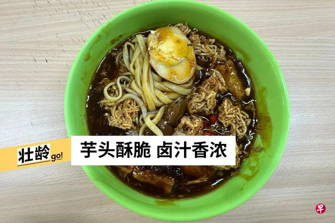 卤面加炸芋头的组合是苏荣添的创新想法。一般卤面配料有炸鱼,炸芋头丝和市场上的卤面不一样。叶亚英说,丈夫是从过去卖五香虾饼的经验找到灵感,做出来后很受顾客欢迎。