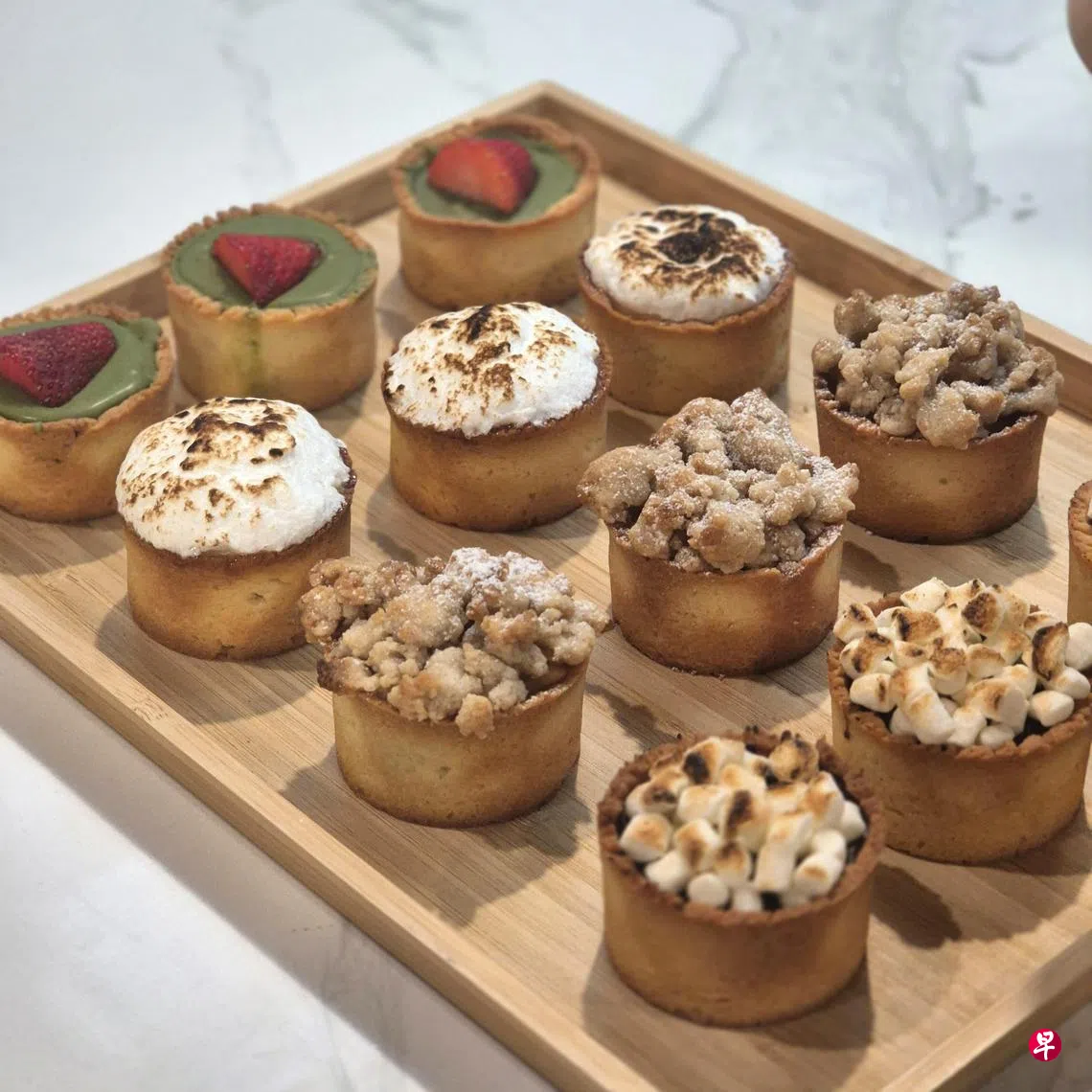 为Baker X特别推出的浓咖啡(Kopi Gao)冰淇淋搭配花生酱吐司($5),就像在咖啡店享用了一顿早餐,面包也是谭君贵自己做的。每天新鲜烘焙的挞($7)搭配一杯咖啡恰到好处,挞的口味有抹茶草莓、苹果奶酥(apple crumble)和黑巧克力等。威化饼一份$4.50,加一勺冰淇淋$4。