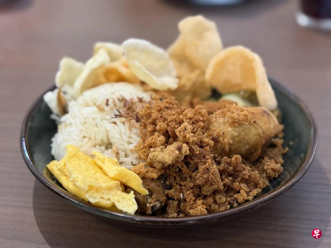 “Sambal Bawang Set” 则以蒜香浓郁的传统洋葱参峇酱(sambal bawang)为主角,搭配热腾腾的白饭、炸饼(krupuk)与印尼恩饼(emping),香辣可口、层次丰富。食客可按喜好选择配料,如三个蛋($7.00)、炸牛尾($13.50),或是Three特制炸鸡($10.00)。