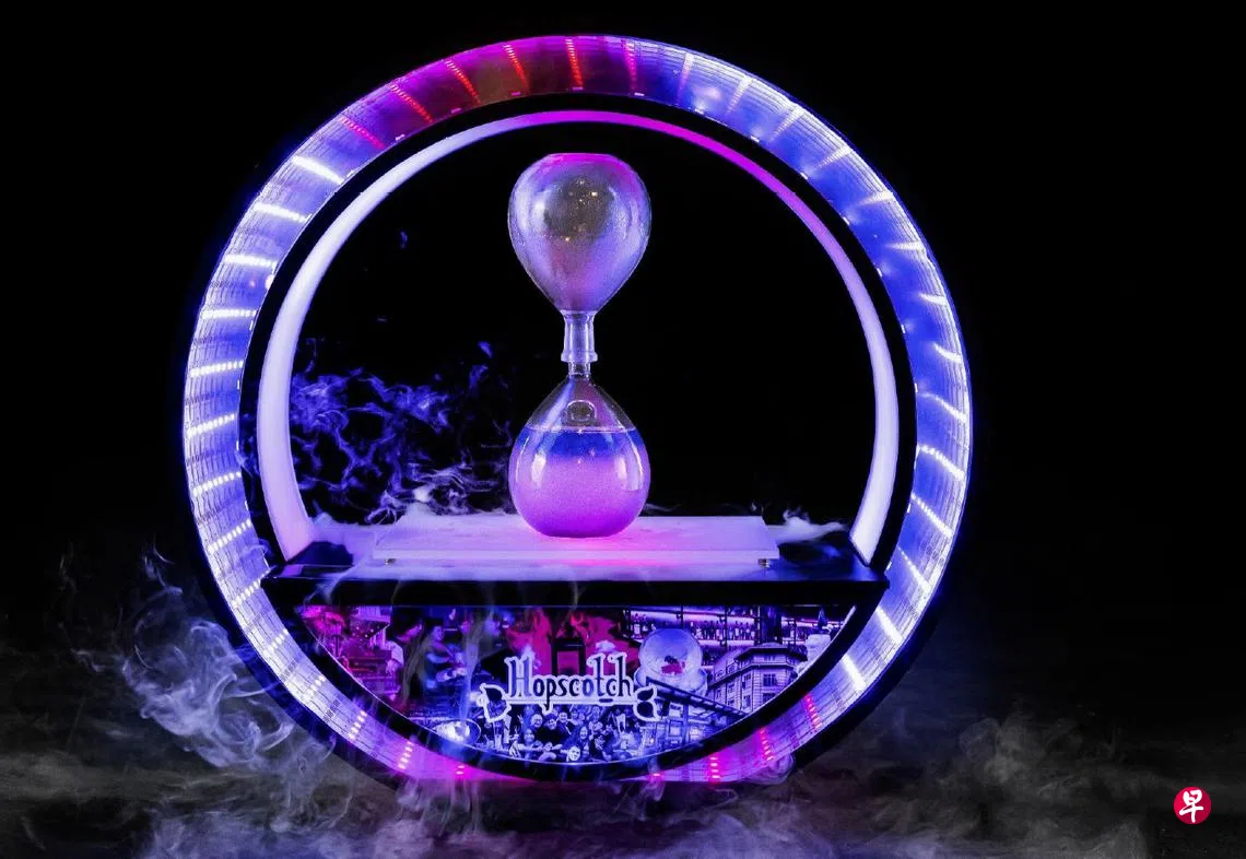 10周年纪念特调“A Decade in Time”融合苹果花与金桔金酒、樱花曼奇诺(sakura Mancino)、红毛榴梿、蝶豆花、啤酒花酊剂(hops tincture),以及一抹巧克力与薄荷。盛装在沙漏杯中,放在光影装置内,犹如一座时光胶囊,邀食客赴一场视觉盛宴。细细品尝每一口的同时还可扫描二维码,了解餐馆的故事。