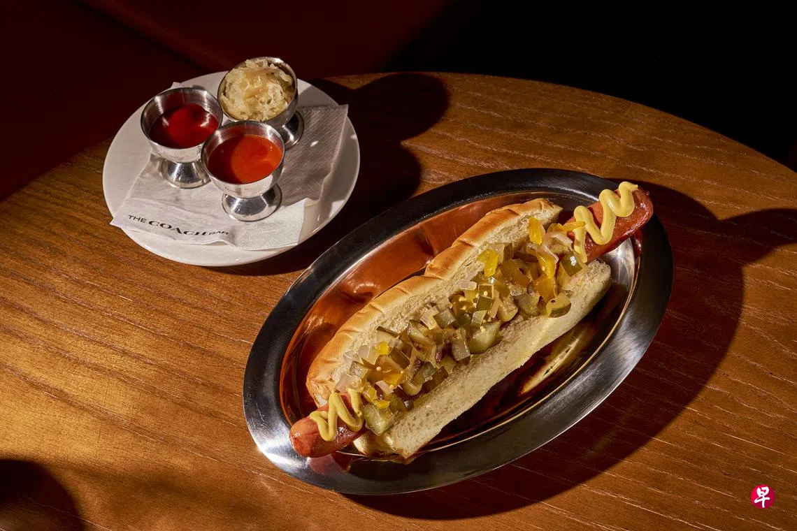 餐饮方面,菜单酒水走美式西餐路线。招牌菜是牛排三文治($25)、和牛肉热狗($30)等。