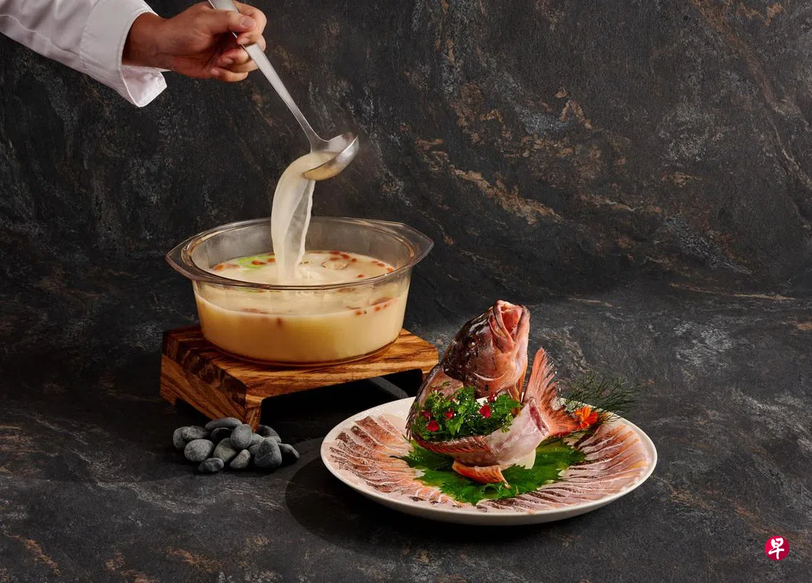 一碗好鱼汤的鲜味关键在于“鲜鱼”和“鲜煮”,奶白浓鱼汤之过桥红斑片(每100克,$22++)展现了这些特质。其灵感源自陈健伦在香港旅行时,朋友为他烹制的一道鱼汤料理,令他倍感温暖与舒心。鱼汤主要食材包括红斑鱼、砂拉越胡椒、大葱和白洋葱,以文火熬煮四五个小时。由于选用的是活鱼,厨师需要亲自宰杀并处理,刀工尤为重要,必须让每片鱼肉厚度一致,达到摆盘的美观。为提供最佳用餐体验,每次只烹煮10片鱼肉,以确保火候统一、口感恰到好处。