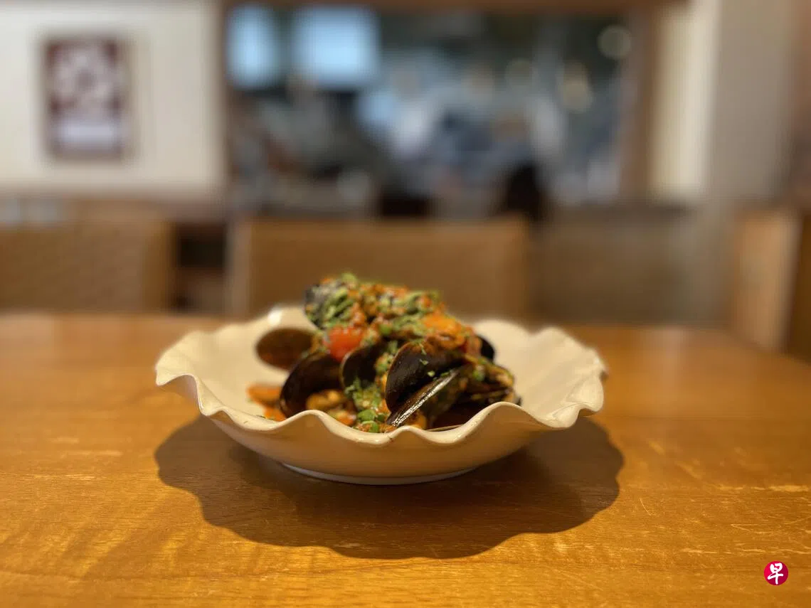 淡菜在西班牙料理是常见食材,用于制作美味的海鲜料理。餐馆的淡菜($32)用意式辣味香肠酱汁nduja烹煮,微辣中带香料芬芳,加上樱桃番茄的酸甜,更是开胃。