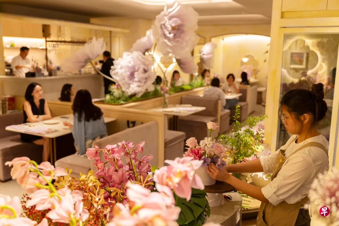 餐馆随处可见牡丹花浮雕和大型纸艺花艺术装置,还有中国传统园林建筑具代表性的海棠花窗设计,结合非遗艺术作品陈列,配合花店和鲜花布置,让食客仿佛置身浪漫疗愈的四季花园用餐。