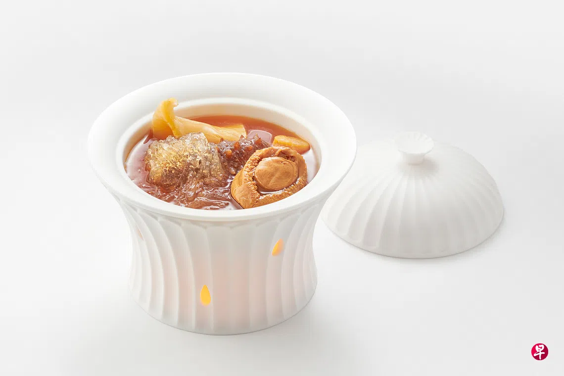 听他这一番形容,能通过不同感官辨识温度和熟度,非一朝一夕功夫。细火慢炖下,汤色如琥珀,盛入猪油白陶瓷汤盅中,颜色视觉上有对比,入口后味道层层分明,含丰富胶原蛋白,让人忍不住慢慢细品回味。