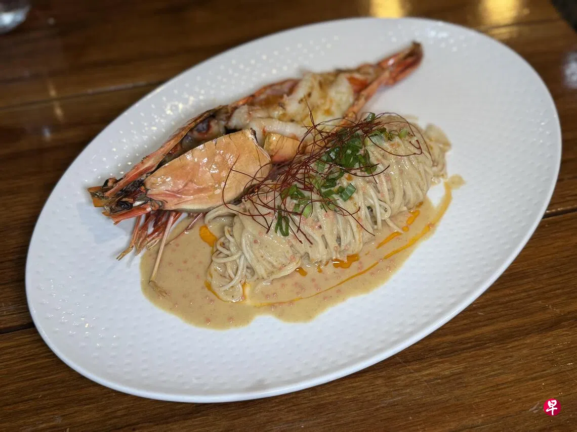 蚝江风云($36)是墨鱼汁海鲜饭的创意演绎,砂锅盛装上桌,香气浓郁。饭粒吸满鲜美汤汁,搭配新鲜微咸的日本坂越生蚝与飞鱼籽,口感丰富。焗大虾拉面($32)则以自制手工面条和浓郁龙虾高汤烹煮,搭配飞鱼籽和香烤大虾,鲜味十足。餐馆还推出超值套餐,四道式午餐$25起;五道式午餐$35起;六道式晚餐$50起。