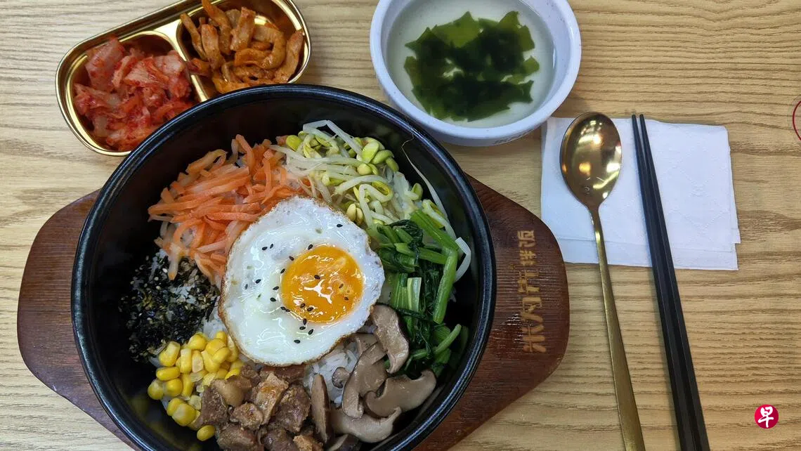 口袋不深的记者就这样被吸引入座,点了限时优惠的招牌石锅拌饭(特价$5.80,原价$7.80)。拌饭很快上桌,有菜、肉、蛋等八种食材,养眼又丰盛。拌饭酱采用单独包装,类似快餐店的辣椒酱包,撕开后直接挤入饭中,迅速搅拌均匀即可。拌饭没有锅巴,不过整体味道不错。