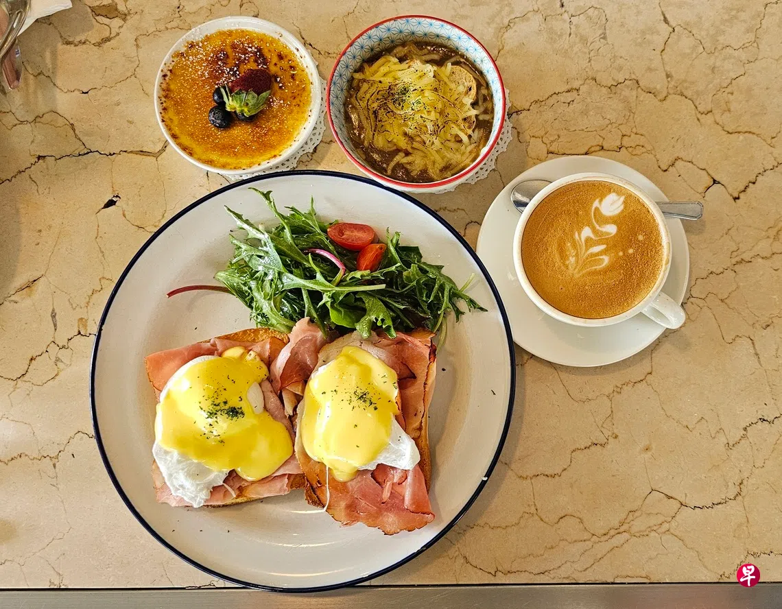 试吃一份三道菜套餐($29.90+),主食为店中人气菜品班尼迪克蛋(eggs benedict),分量十足,法式面包铺上水波蛋和火腿,淋上自制荷兰酱,搭配一碗洋葱汤和拉花咖啡,组成套餐。洋葱焦化后,释出香甜,乳酪盖面后再烤焗,添一抹咸香。这样的早午餐简单却满载美味,让人心满意足。