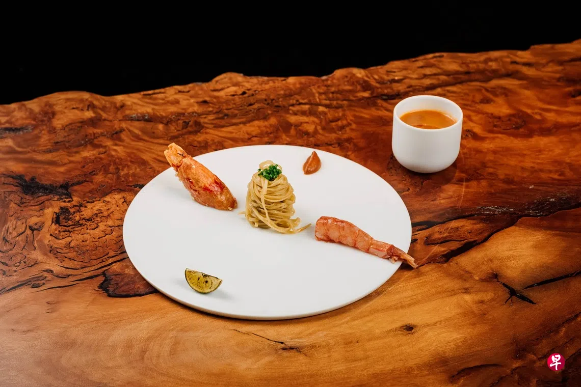 精致版虾面汤,以自制鸡蛋面配大红虾。汤汁用虾头、虾壳、蒜头、干贝等多种食材熬制,喝出层层风味。其他如前菜面包咖啡布里欧、甜点咖椰吐司等,都是熟悉的美味。午餐套餐收费$208++,晚餐$298++。