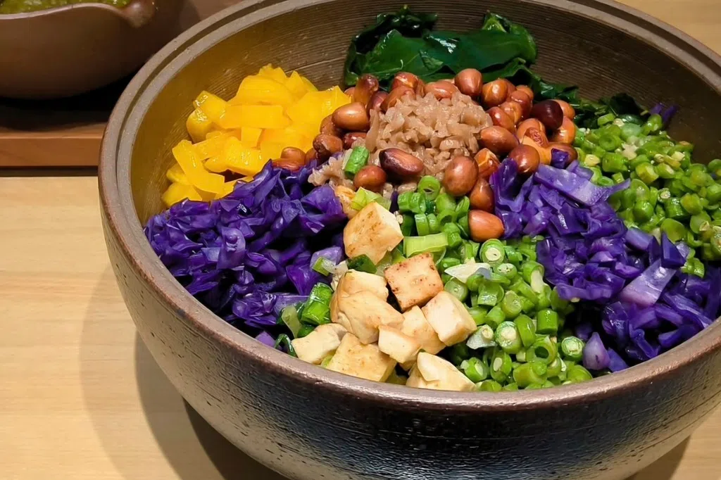 七彩25谷米擂茶饭(一人份$9.90,二至三人份$19.90)色彩斑斓,含多种谷类。陈奕妏说:“25谷米按比例调配,既可口又营养丰富,比白米更具养生效果。七彩擂茶饭除了五谷米,还有绿色马尼菜、黄色灯笼椒和紫色包菜,并保留具客家特色的青蒜炒豆干等。”