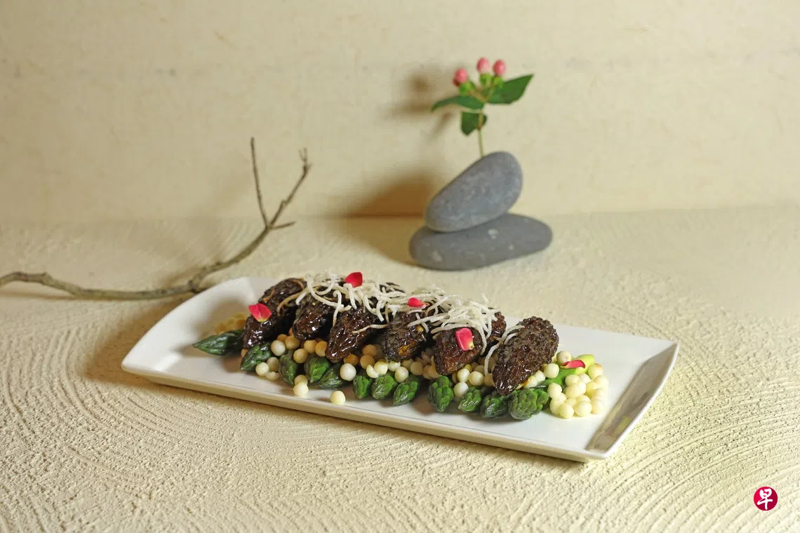 芝士焗时蔬($26.80++)是一道融合菜,老少咸宜。番茄、西兰花等时蔬上覆盖一层乳酪,放入烤箱焗烤至金黄色,端上桌时一勺舀出食物,只见乳酪层层拉丝,食欲大开。三杯煎酿羊肚菌($38.80++),口感醇厚,麻油、酱油和米酒的三杯酱,香气十足。