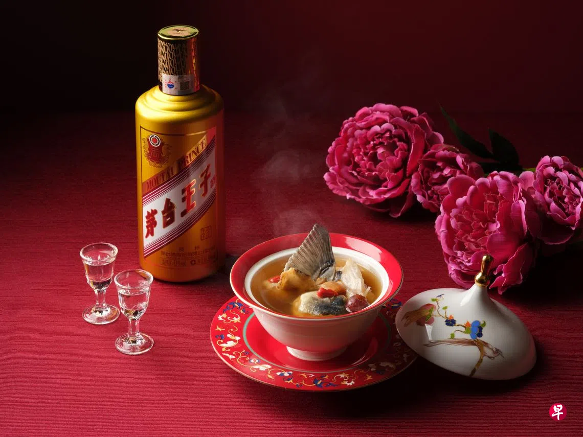 另一道河豚料理是经八小时慢火熬制的茅台酒香河豚骨鳍炖汤,烹煮过程中倒入贵州茅台“金王子”,上桌时再加一点,画龙点睛。汤色清澈透亮,河豚清甜滋补。