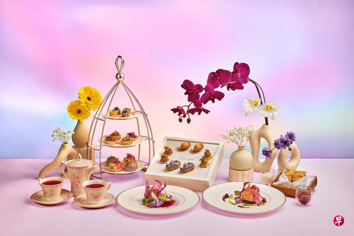下午茶以紫色为主题,紫色是国际妇女节的代表颜色。食物包括:紫薯三文鱼配蓝莓黑皮诺(Pinot Noir)酱、炖牛肉小排、各类三文治、蓝莓抹茶乳酪蛋糕等。每人收费$68++,订位电话:62134398。