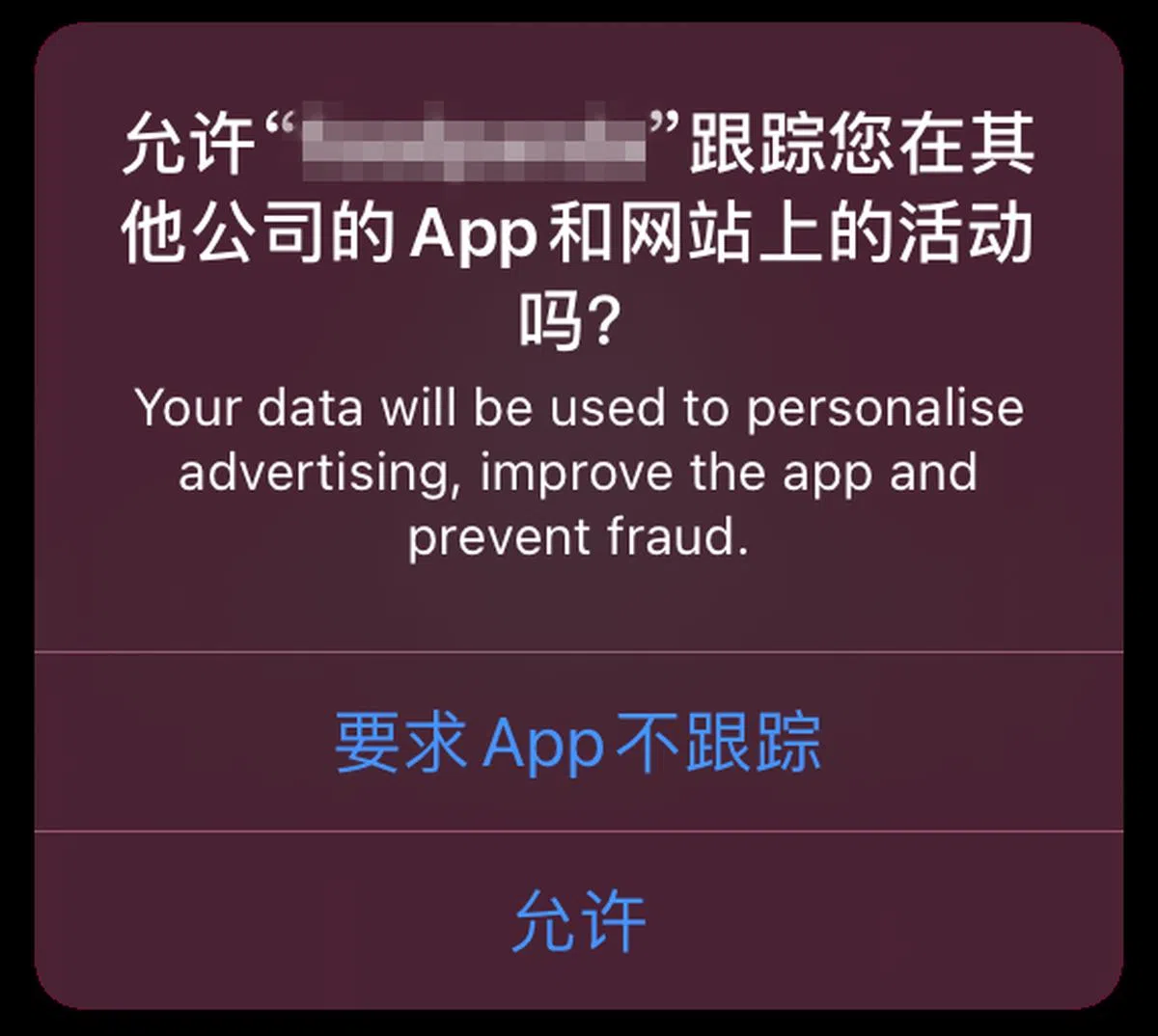 安装新系统后,苹果用户可以在隐私设置的跟踪栏目下,选择允许或不允许应用向用户提出跟踪请求。当用户打开拥有跟踪手段的应用时,手机会提示:要求应用不跟踪,或者,允许跟踪。