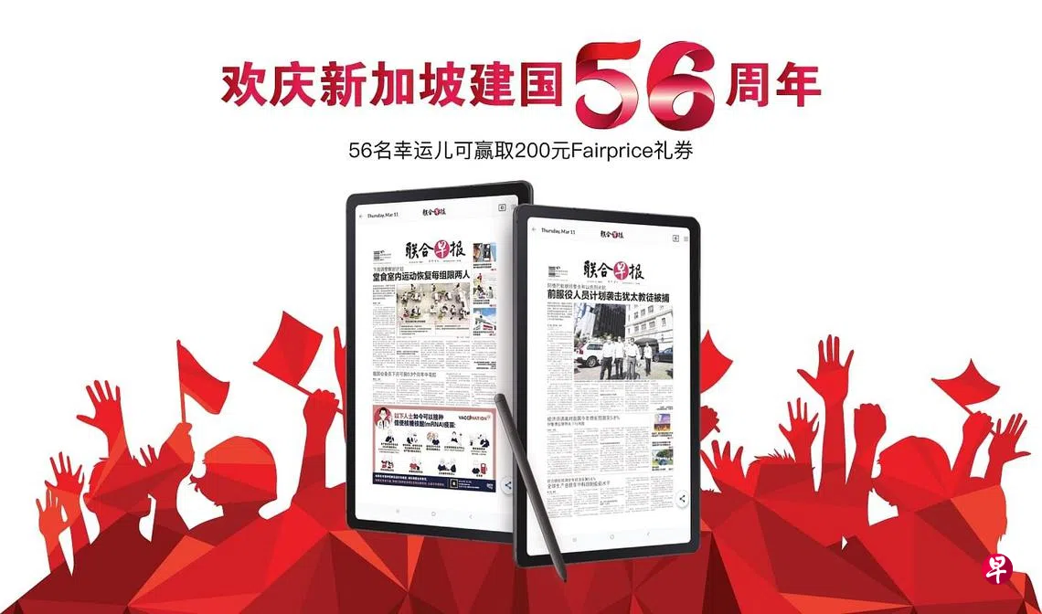 为了欢庆新加坡建国56周年,现在凡订阅“早报平板电子报配套”除了能选择两款三星平板电脑外,也能参加大抽奖赢取总价值超过1万元的职总平价(FairPrice)礼券。