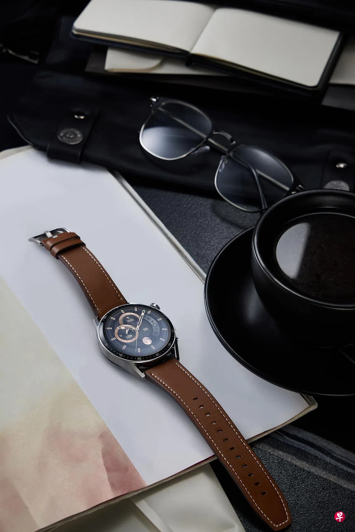 Watch GT 3不锈钢表壳经过抛光处理,搭配浅棕色真皮表带,看起来时尚又高档。右上方的旋转表冠带触感反馈,震动感觉干脆利落。调节各种数值,滑动界面,观看选项等都可以转动表冠来实现,高效便捷。表冠上表面精雕“HUAWEI WATCH GT”字样,外圈有细密齿纹,让手表显得更有档次。如果你不喜欢真皮表带,华为也有黑色塑料表带的选择。