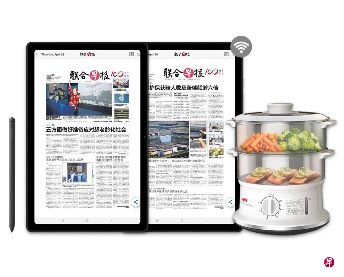 母情节限时好礼,凡订阅《联合早报》平板电子报配套或早报印刷及数码综合配套,将免费获得价值$119的Tefal不锈钢两层电蒸锅。它容易存放,占空间小,有定时器设置,而且容易清洗。平板电子报配套有两款平板选择,分别是三星Galaxy Tab A8 Wi-Fi(价值$448)或Galaxy Tab S6 Lite LTE(价值$698)。
