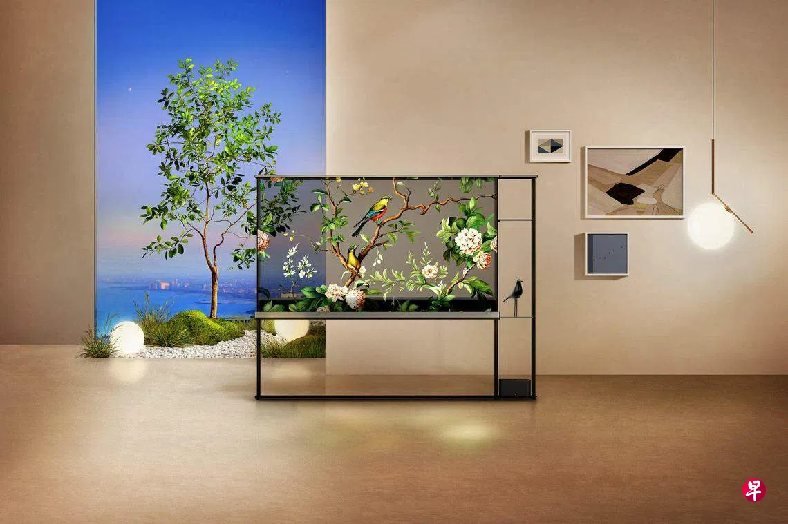 韩国LG电子在CES上发布77英寸屏的OLED T透明电视,具有高达4K分辨率。OLED T有两层屏幕,前方是一块彩色显示透明面板,后方是一张对比膜,使用者只要开启电视,后方的对比膜便会升起,让OLED T的显示像一般OLED电视。如果用户没看电视,对比膜会降下,电视就变透明,在常亮显示(AOD)模式中可展示画作、视频或照片。透明屏幕上显示的内容看似漂浮在空中,但同时与周围空间融合,非常特别。