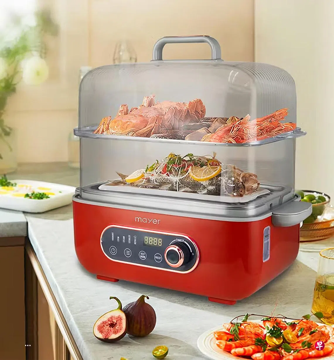 附带不锈钢蒸盘,可蒸海鲜、肉类、鱼类、面食、杂粮和热饭菜。水若蒸发完,机身会自动断电,加强安全性。12小时自动保温功能。