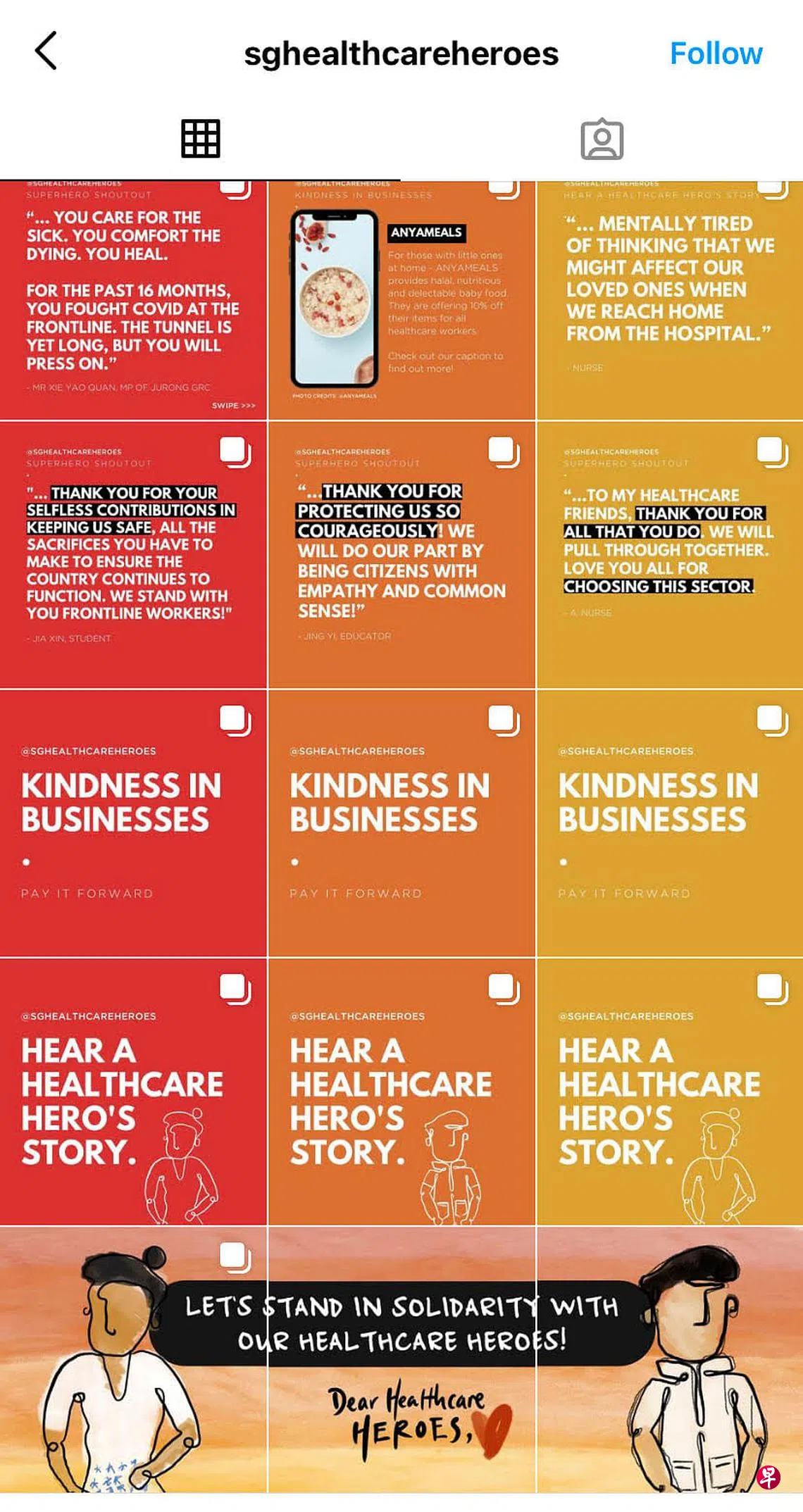 针对近期发生医护人员遭受歧视事件,14名年轻人设立社交媒体账号@sghealthcareheroes,呼吁本地人通过Instagram(IG)以文字、绘图创作等方式鼓励医护人员。