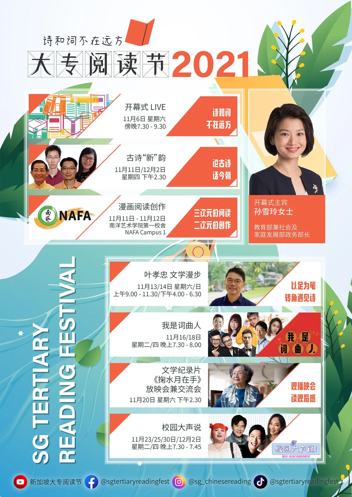 开幕式主宾为教育部兼社会及家庭发展部政务部长孙雪玲。详情可浏览活动网站:bit.ly/tertreadingfest,也可关注IG@sg_chinesereading和Tiktok:sgtertiaryreadingfest。