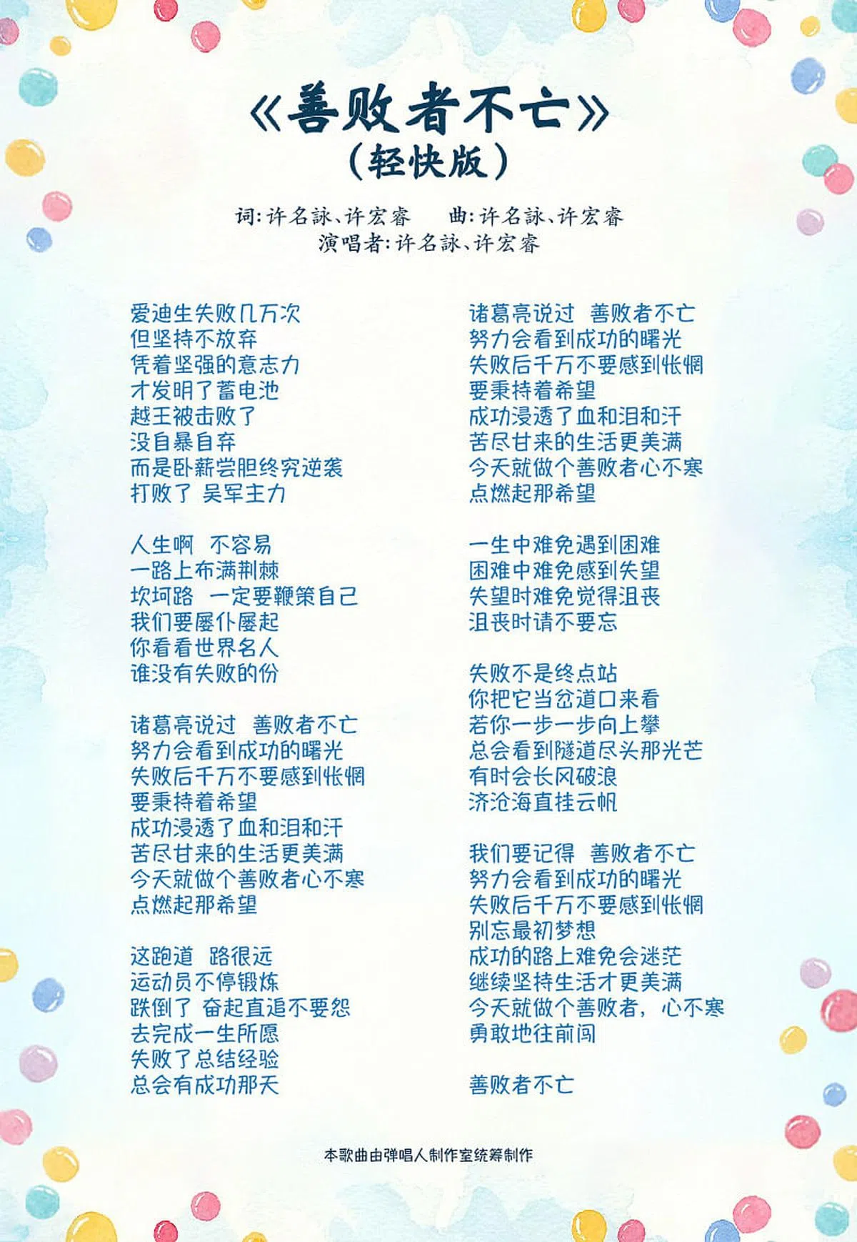 新空下2021创作合辑:《善败者不亡 》(轻快版)《善败者不亡 》(轻快版)词曲是由许名詠(德明政府中学)和许宏睿(南洋理工大学)所创作。 本歌曲由弹唱人制作室统筹制作。所有入选作品的词曲版权归属推广华文学习委员会。浏览新空下专题页面,就可以知道更多相关信息! 新空下全国学生新谣歌唱及创作比赛新谣上一篇“新空下”新谣音乐分享会 千名中学生感受新谣魅力下一篇新空下2021创作合辑:《善败者不亡》(说唱版)