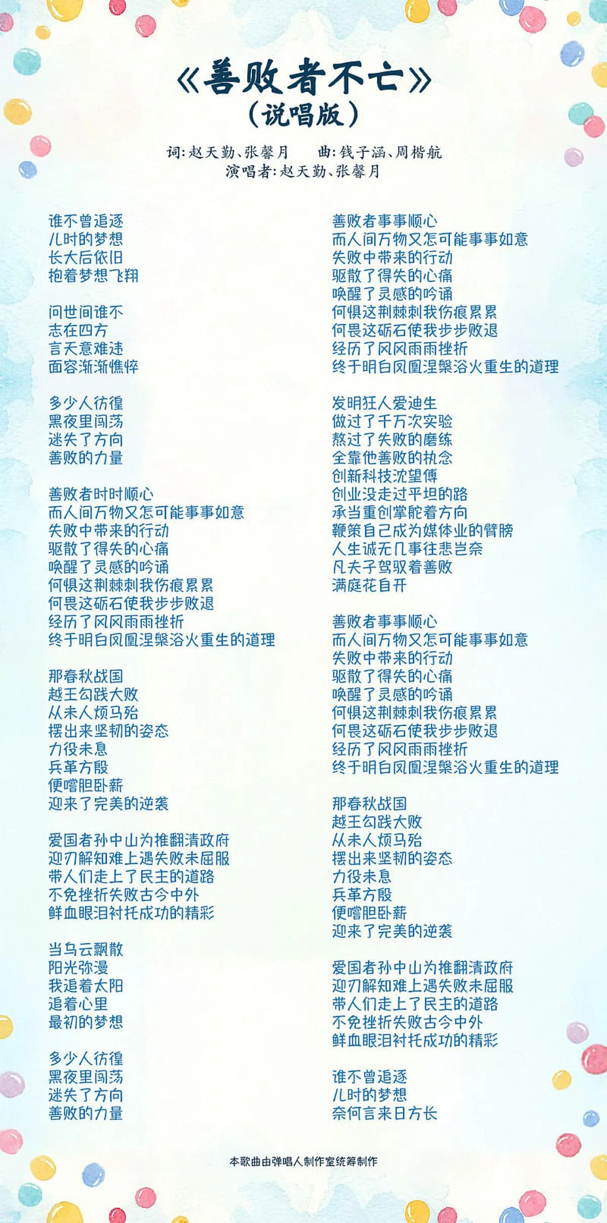 《善败者不亡》(说唱版)的词是由赵天勤(莱佛士书院)、张馨月(莱佛士女子中学)填写,曲则是来自莱佛士书院的钱子涵、周楷航所创作。