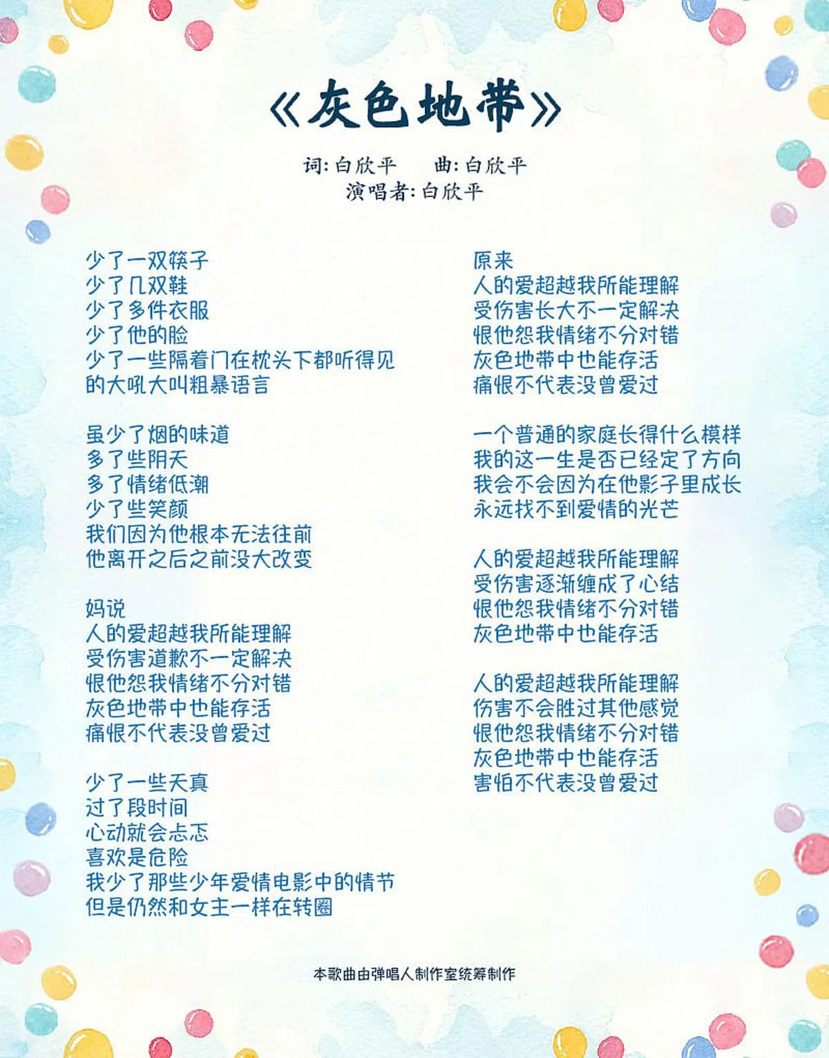 新空下2021创作合辑:《灰色地带》《灰色地带》词曲是由华侨中学(高中部)的白欣平所创作。 本歌曲由弹唱人制作室统筹制作。所有入选作品的词曲版权归属推广华文学习委员会。浏览新空下专题页面,就可以知道更多相关信息! 新空下全国学生新谣歌唱及创作比赛新谣上一篇新空下2021创作合辑:《写下的回忆》下一篇新空下2021创作合辑:《愿你》