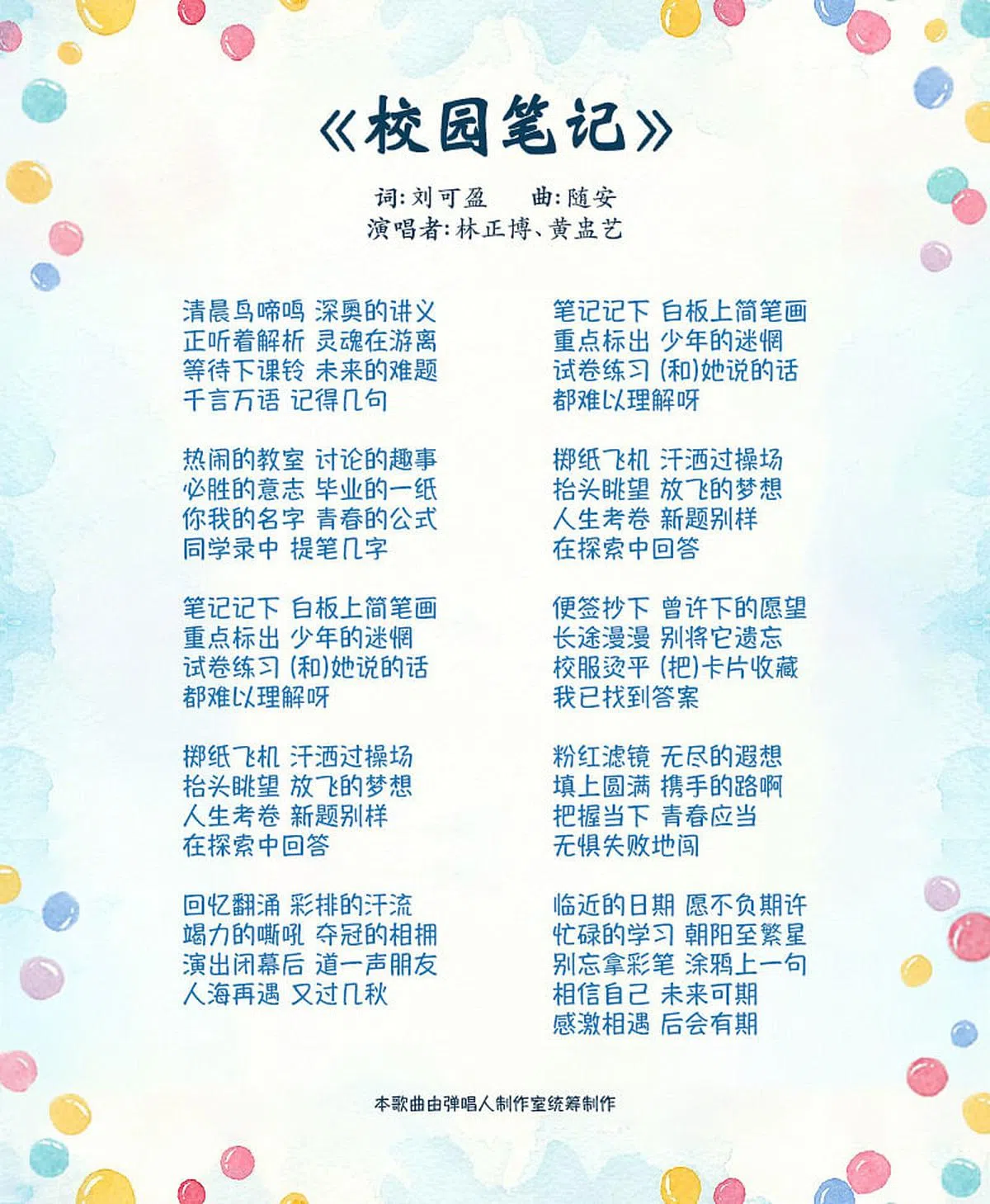 新空下2021创作合辑:《校园笔记》《青春篇章》的作曲人是随安老师,也是本地经典新谣歌曲《关怀方式》的作曲人。歌词则由新加坡理工学院的刘可盈填写。 本歌曲由弹唱人制作室统筹制作。所有入选作品的词曲版权归属推广华文学习委员会。浏览新空下专题页面,就可以知道更多相关信息! 新空下全国学生新谣歌唱及创作比赛新谣上一篇新空下2021创作合辑:《青春篇章》下一篇新空下2021创作合辑:《我们的故事》