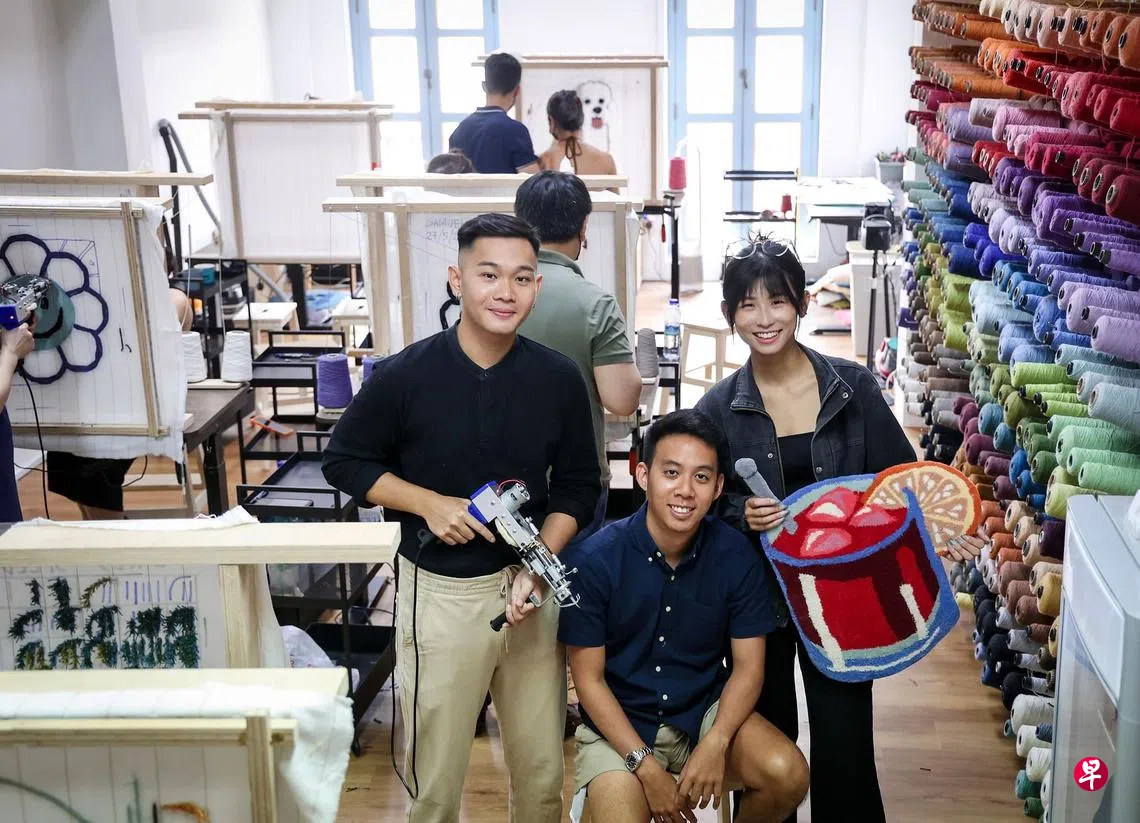 Tuft Club由陈伟哲(26岁)、苏慧宜(26岁)和郑宇杰(25岁)三人创办,此前他们共同经营一家戳针绣(punch needle)和夜光画的工作坊。去年初,他们在社交媒体上看到国外有人居家隔离期间,在自家地下室里用簇绒枪织地毯,逐渐走红。苏慧宜心想:“本地很少住家有地下室,准备器材毛线也很麻烦。”于是有了创业的灵感。