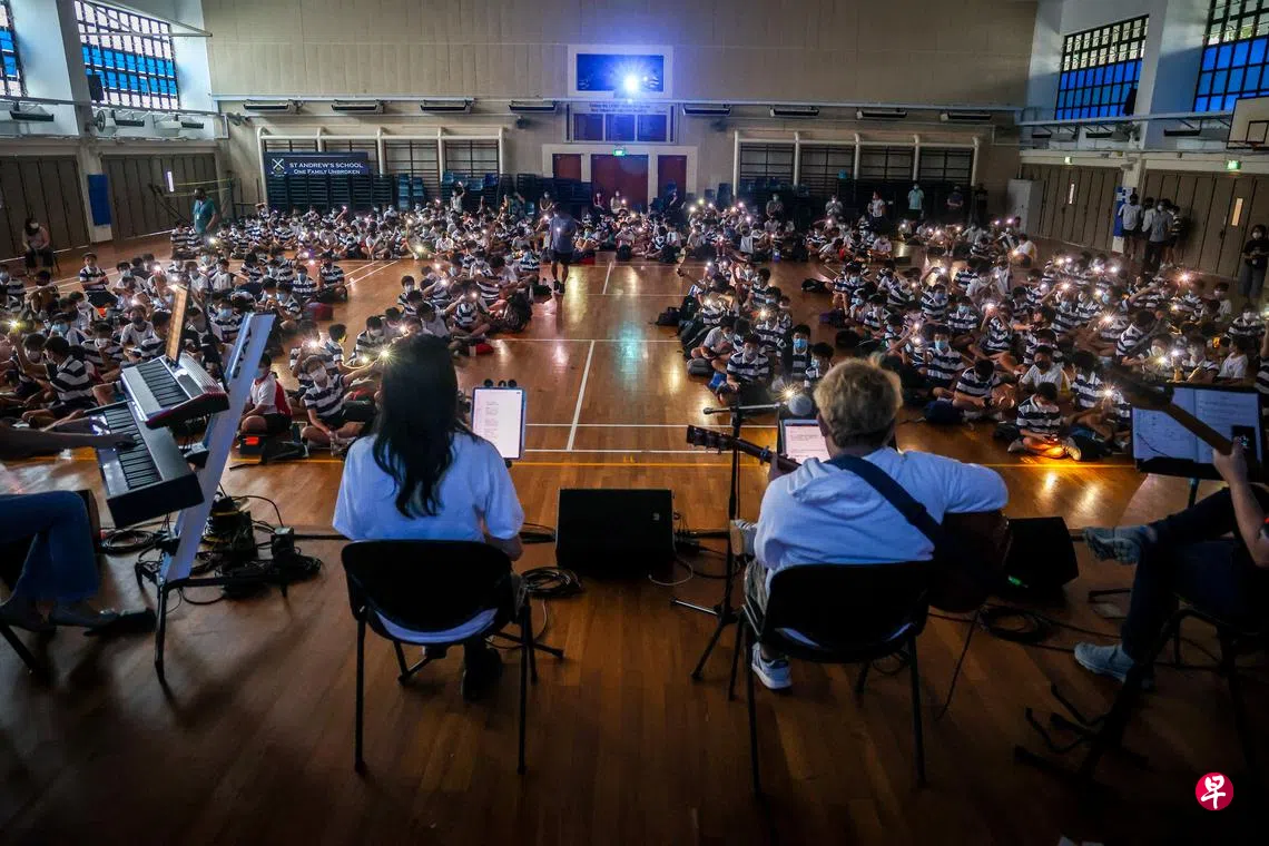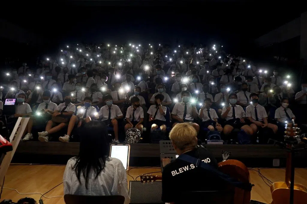 《城里的月光》勾起华侨中学陈威(16岁)和高智恩(14岁)满满的回忆。这也是他们分享会中印象最深刻的歌曲。华侨中学1600名学生通过线上方式参与新谣音乐分享会。