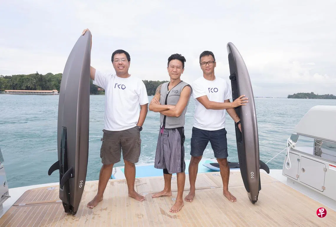 The Kinetic Option(TKO)是去年由本地四名“老男孩”成立的公司,设计生产电动力冲浪板。四人来自不同领域,因疫情时期共同开发的新爱好玩到一起,联手创业。工程师刘健成(42岁)拥有丰富的船舶设计经验;首席产品测试师黄思天(41岁)是本地颇有名气的霹雳舞教练;工程师杨棕耀(42岁)此前是新加坡科技研究局的制药化学工程师;投资人何欣平(42岁)是急诊医生,也是刘健成的小学同学。