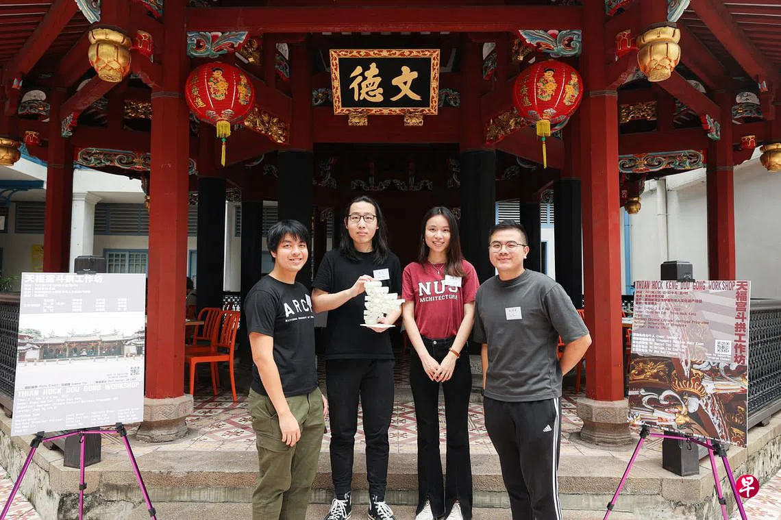 斗拱是华族传统建筑精妙的木构件组合,由“斗”和“拱”以卯榫相连接,不必使用粘合剂和钉子。新加坡国立大学建筑系师生在天福宫崇文阁办斗拱工作坊,学生也在老师的指导下做出新加坡首创的斗拱积木。