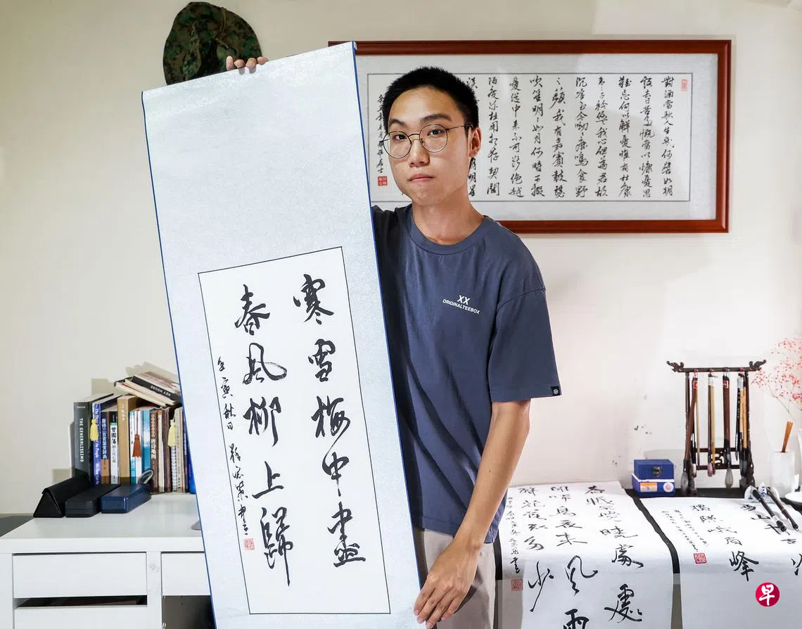 理工男爱上写书法,无师自通也自得其乐。正在国民服役的苏宏策(22岁)毕业于新加坡理工学院,明年将入读新加坡国立大学进修土木工程专业;课余时间,他在笔墨纸砚间创造一个完全不同的精神世界,以诗词歌赋与古人圣贤吟诗作对。