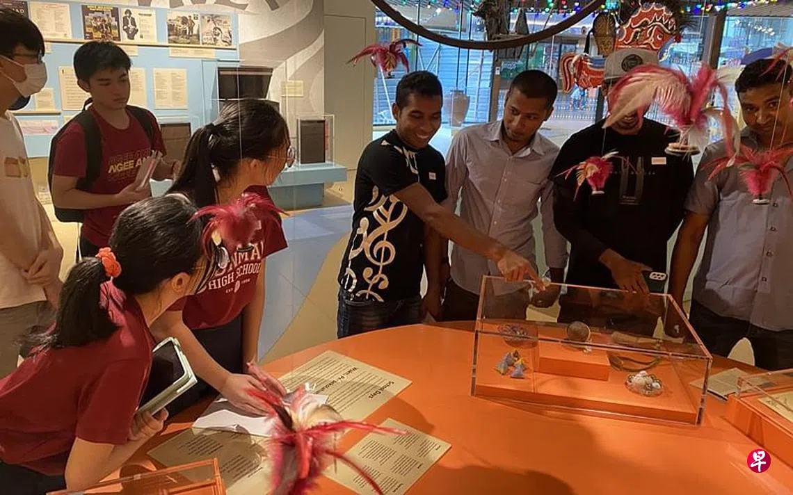 客工参与活动时,学生在旁讲解,并和他们交流。德明政府中学(高中部)学生陈靖霓说,通过这次的活动希望能让客工发现他们的家乡与新加坡之间有文化相似的地方,鼓励他们与本地人互动。